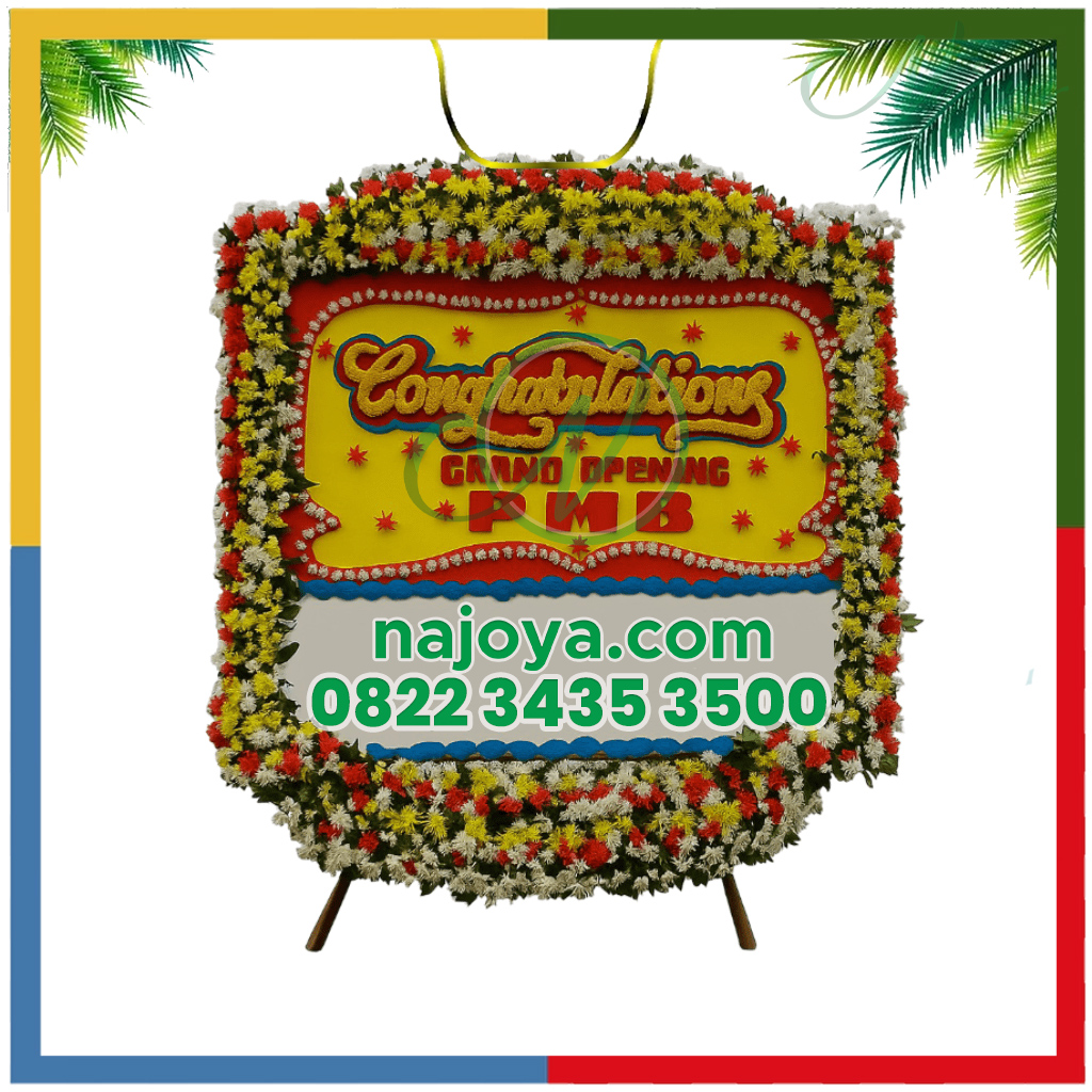 Bingkai papan dihiasi dengan rangkaian bunga segar berwarna merah, kuning, dan putih yang mengelilingi seluruh papan, menciptakan kesan penuh warna dan elegan. Kombinasi warna yang harmonis dan desain yang terstruktur rapi menjadikan bunga papan ini tidak hanya sebagai simbol ucapan selamat, tetapi juga sebagai elemen dekoratif yang mempercantik suasana acara.