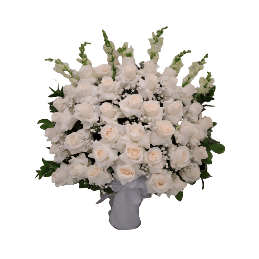 Palet warnanya murni dan bersih, didominasi putih yang melambangkan kesucian dan kemewahan. Mawar putih yang mekar sempurna menjadi fokus, disusun secara masif untuk kesan subur. Filler flower putih seperti baby’s breath menambah tekstur halus, sementara snapdragon putih yang menjulang memberikan dimensi vertikal yang kuat. Beberapa daun hijau segar juga menjadi aksen alami.