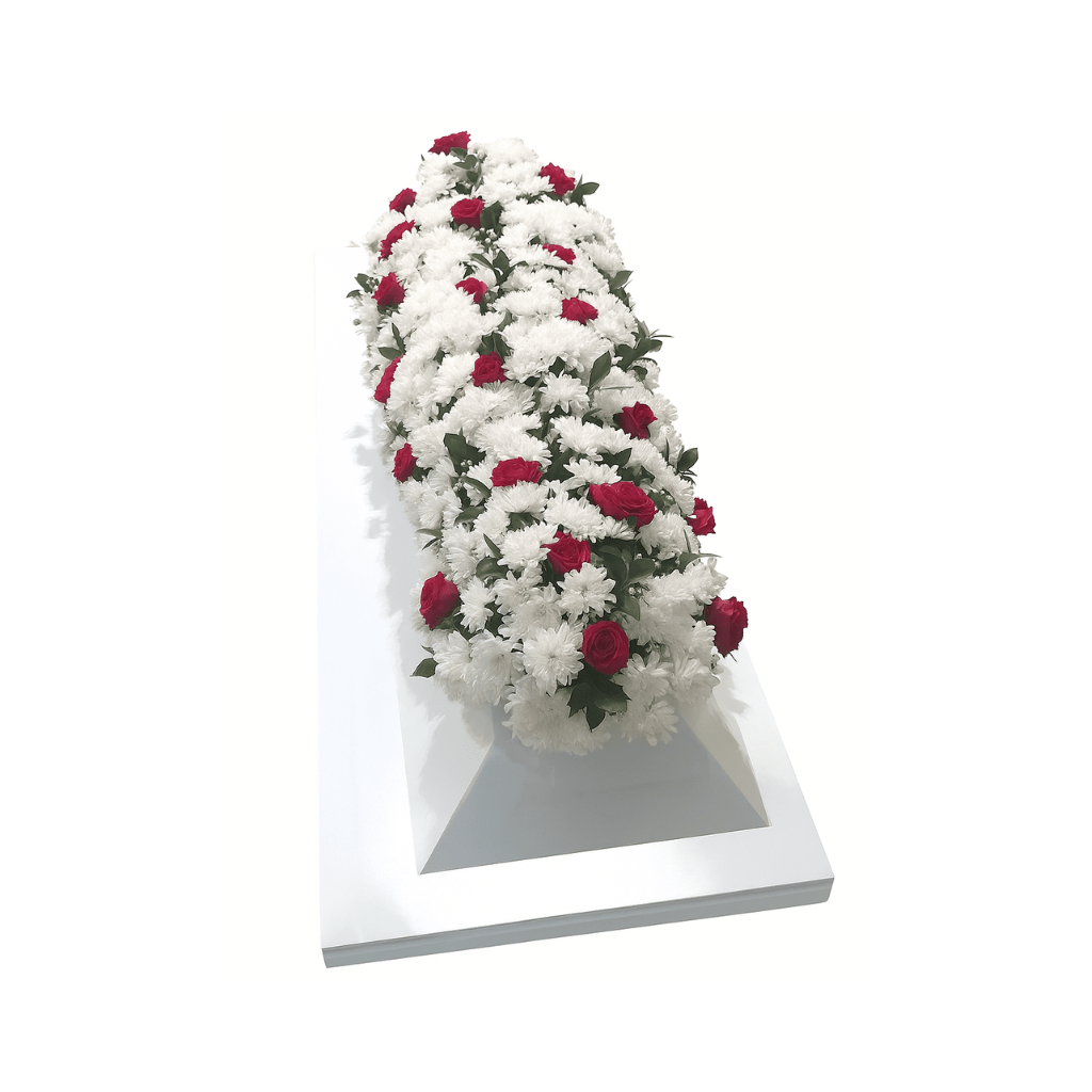 Dengan dominasi bunga krisan putih yang membentang penuh di atas tutup peti, rangkaian ini menyampaikan suasana damai dan khidmat. Setiap kuntum krisan disusun rapat dan simetris, memberikan kesan penuh dan megah yang merepresentasikan ketulusan doa dari keluarga serta orang-orang terkasih. Di antara warna putih tersebut, mawar merah segar ditanamkan dengan ritme yang teratur dan proporsional, menyimbolkan cinta abadi, penghargaan mendalam, serta perpisahan yang penuh penghormatan.