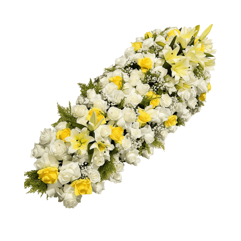 Dengan desain memanjang yang mengikuti bentuk peti, Bunga Tutup Peti Garland disusun sedemikian rupa untuk memberikan tampilan yang rapi, harmonis, dan menyentuh hati. Setiap tangkai bunga mawar putih tersusun rapat membentuk lapisan utama yang menenangkan, sementara mawar kuning tersebar dengan irama lembut untuk memberi sentuhan kehangatan dan kedekatan emosional. Dilengkapi dengan bunga lily putih yang melambangkan kemurnian dan kebaikan jiwa, serta daun pakis hijau yang memperkuat tampilan natural, rangkaian ini menghadirkan harmoni warna dan makna yang dalam.