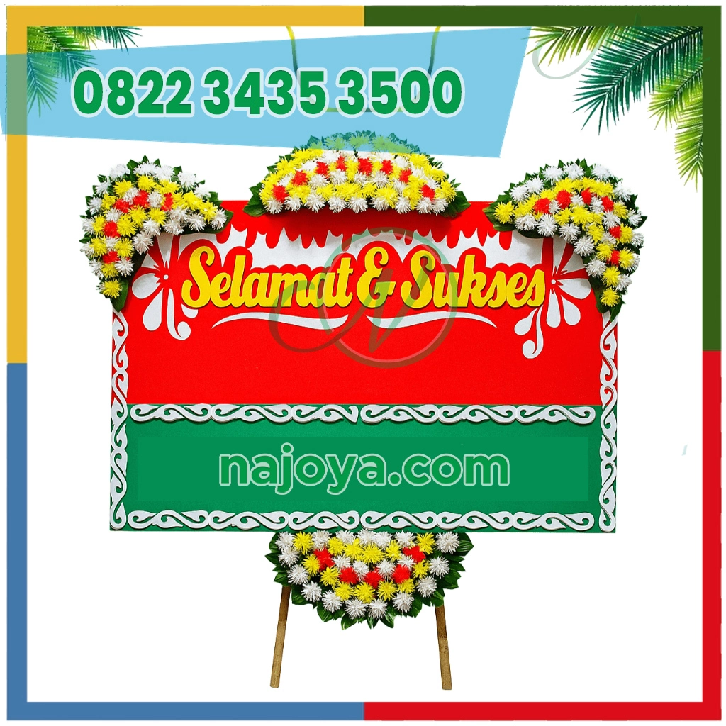 Bunga Papan Congratulations Grandeur adalah manifestasi kemegahan dan ucapan selamat yang paling prestisius, didesain secara khusus untuk memperingati pencapaian luar biasa dan momen monumental dengan penuh kehormatan. Papan bunga ini menampilkan desain yang kontras namun harmonis, menonjolkan bagian utama berwarna merah menyala yang melambangkan semangat dan keberanian, dihiasi dengan tulisan “Selamat & Sukses” yang tercetak jelas dengan font kuning yang ceria dan mencolok, memastikan pesan kebahagiaan terbaca sempurna dari kejauhan. Pada bagian atas papan, serta sebagai aksen di kedua sisi, rangkaian bunga segar berwarna kuning cerah dan putih bersih tersusun apik, menciptakan paduan visual yang memukau. Bunga kuning melambangkan kebahagiaan, optimisme, dan keberuntungan, sementara bunga putih merepresentasikan kemurnian, awal yang baru, dan kesuksesan yang gemilang. Bagian bawah papan berbalut warna hijau segar yang memberikan kesan alami dan pertumbuhan, di mana nama florist “Khayla Florist” tercetak dengan jelas, menegaskan identitas penyedia. Seluruh bingkai papan dihiasi dengan ukiran border putih yang artistik, menambahkan sentuhan elegan dan tradisional. Struktur ini ditopang oleh kaki penyangga yang kokoh, menjamin papan bunga berdiri tegak dan stabil di lokasi perayaan.