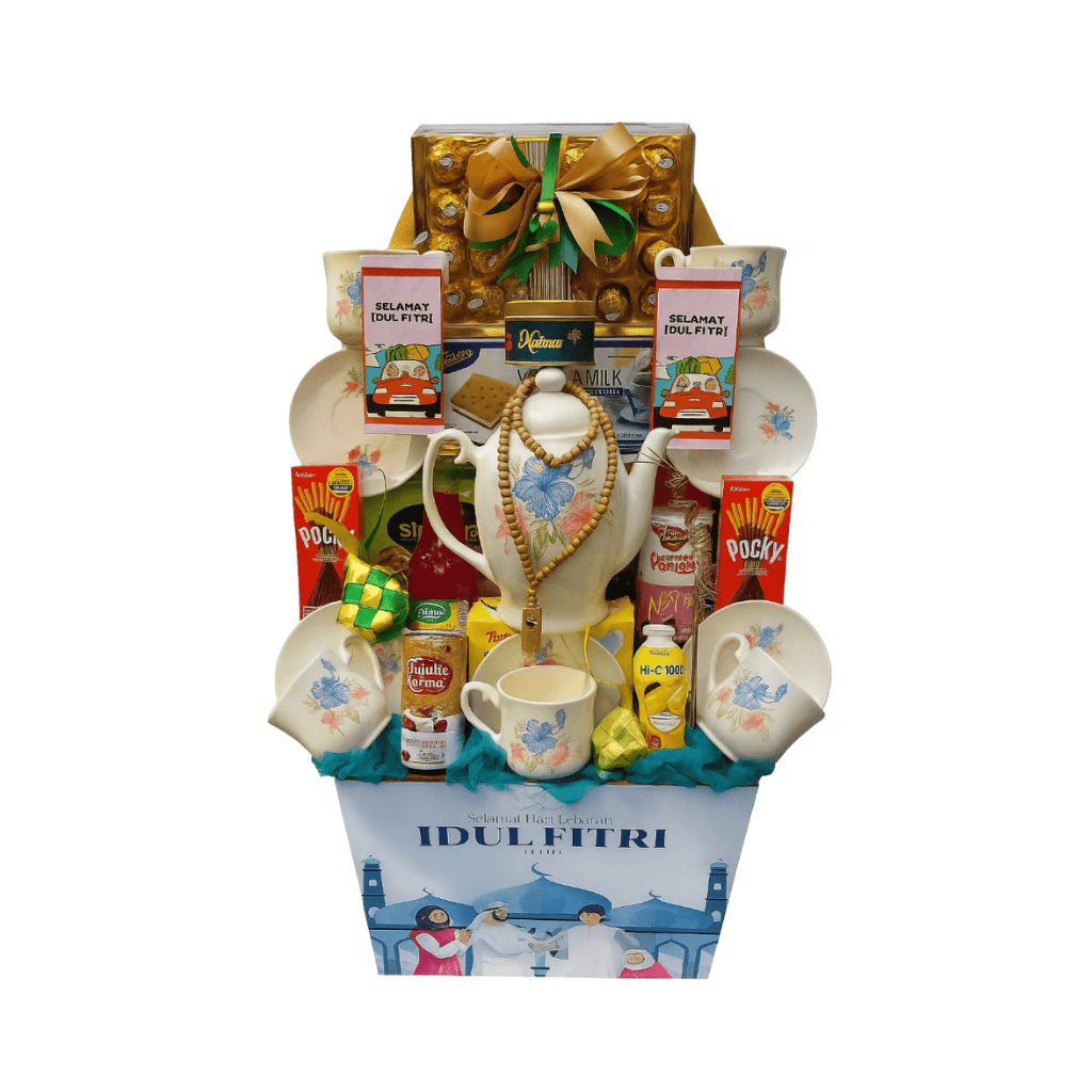 Parcel Lebaran Jumakeid merupakan perpaduan sempurna antara keindahan, kegunaan, dan kelezatan. Isi parcel ini sangat lengkap dan mewah. Di bagian tengah terdapat satu set teko dan cangkir keramik bermotif bunga lembut yang elegan, lengkap dengan gelas, cangkir, dan piring saji, menjadikannya sebagai hadiah fungsional yang bisa digunakan dalam kegiatan sehari-hari seperti menyambut tamu di hari Lebaran. Aksen tasbih kayu yang menggantung di leher teko menambah sentuhan religius yang memperkuat nuansa Idul Fitri.