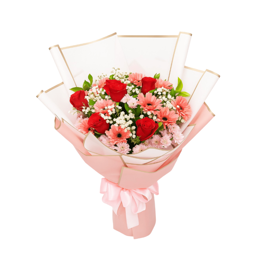 Buket ini didominasi oleh merah menyala (gairah, keberanian) dan pink (kelembutan, kasih sayang). Bunga utamanya adalah mawar dan gerbera yang mekar sempurna. Rangkaian ini dibungkus dengan kertas wrapping pink muda, putih, dan emas, menciptakan tampilan modern dan elegan.