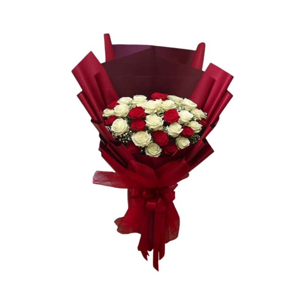 Bunga HandBouqet Sonquella menampilkan cinta dan ketulusan, rangkaian indah mawar merah dan putih yang melambangkan cinta abadi dan ketulusan hati. Dibungkus wrapping merah marun mengkilap dengan pita besar yang mewah, Sonquella adalah hadiah sempurna untuk lamaran, wisuda, ucapan terima kasih, atau momen spesial lainnya.