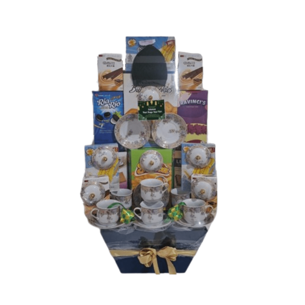 Isi dari Parcel Lebaran Taqwied terdiri dari berbagai produk pilihan yang berkualitas tinggi. Parcel ini menghadirkan set cangkir teh dan piring elegan yang dihiasi dengan motif bunga, memberikan kesan klasik dan mewah bagi penerimanya. Set cangkir ini sangat cocok untuk digunakan saat menyambut tamu di Hari Raya, menciptakan suasana hangat saat berbincang dan bersilaturahmi dengan keluarga serta sahabat.