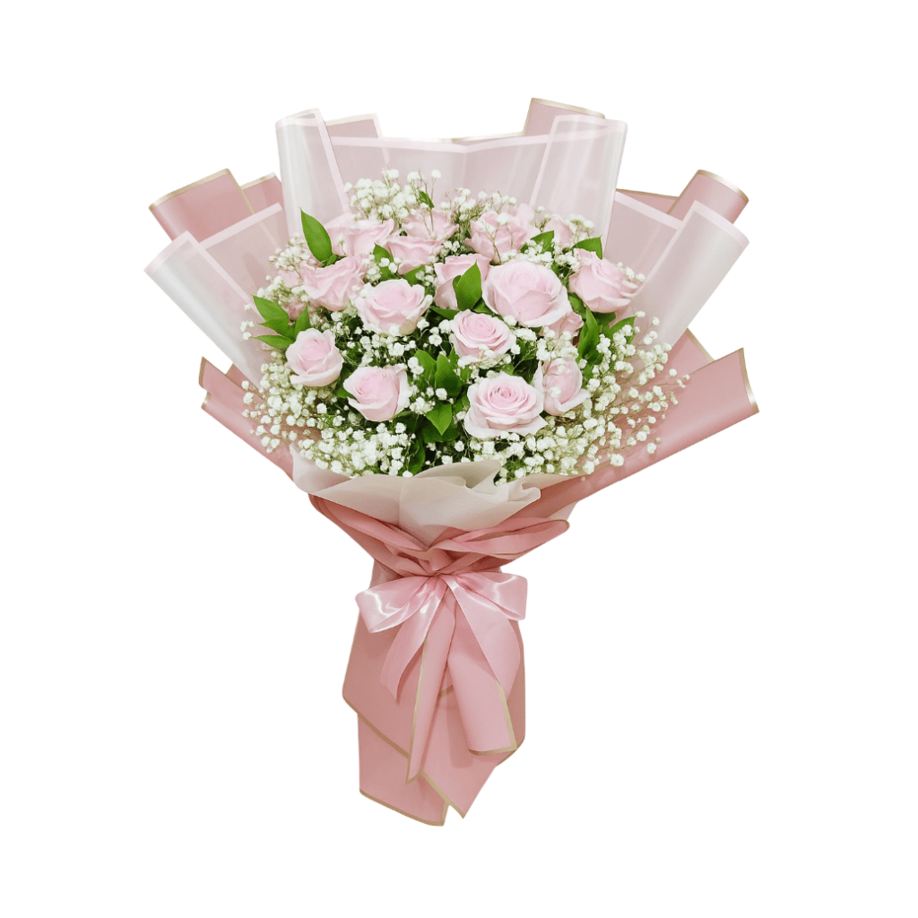 Palet warnanya murni dan menenangkan, didominasi pink muda dan putih bersih. Mawar pink yang mekar sempurna menjadi simbol keanggunan dan kelembutan. Rangkaian ini dibungkus kertas wrapping pink muda dan putih, menciptakan tampilan halus dan elegan.