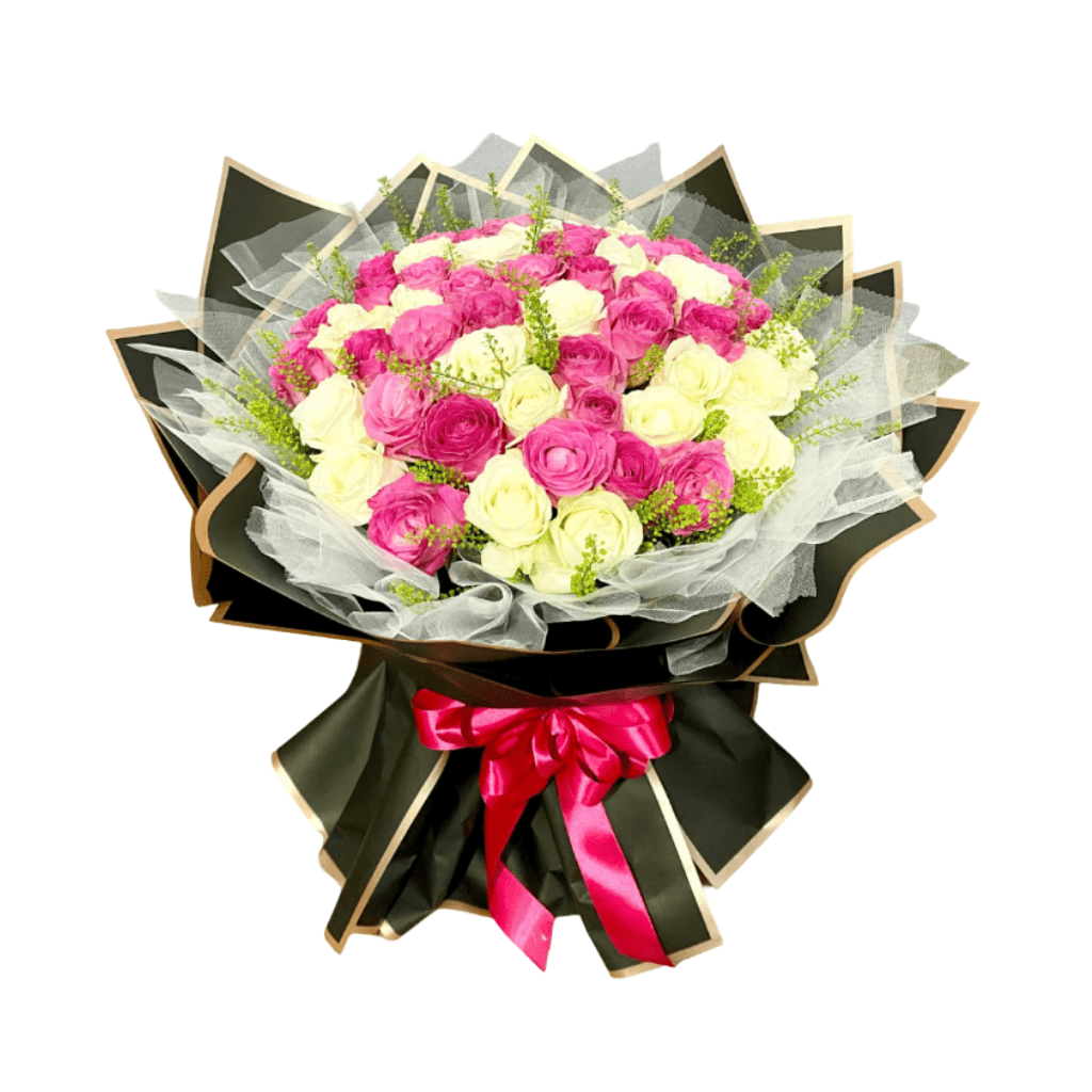 Buket ini menampilkan palet warna kuat dan kontras: pink fuchsia (kebahagiaan, energi), putih bersih (kemurnian, keanggunan), dan hitam (modern, mewah). Bunga utamanya adalah mawar pink fuchsia dan putih yang mekar sempurna. Rangkaian dibungkus kertas wrapping hitam dan emas, menciptakan tampilan modern dan mewah.